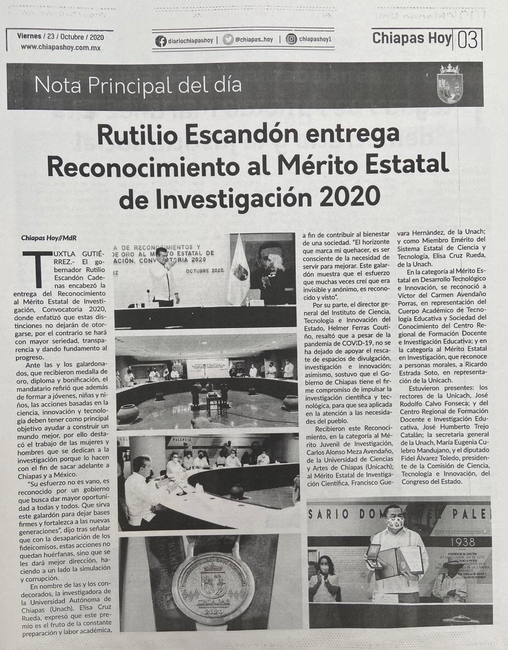 En el evento que fue atestiguado por el director General del Instituto de Ciencia, Tecnología e Innovación de Chiapas, Helmer Ferras Coutiño y con la representación de los premiados, Elisa Cruz Rueda, agradeció este reconocimiento hecho por el Gobierno de Chiapas.